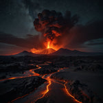 A dramatic volcanic landscape with flowing lava, steaming vents, and a dark, starry sky 2