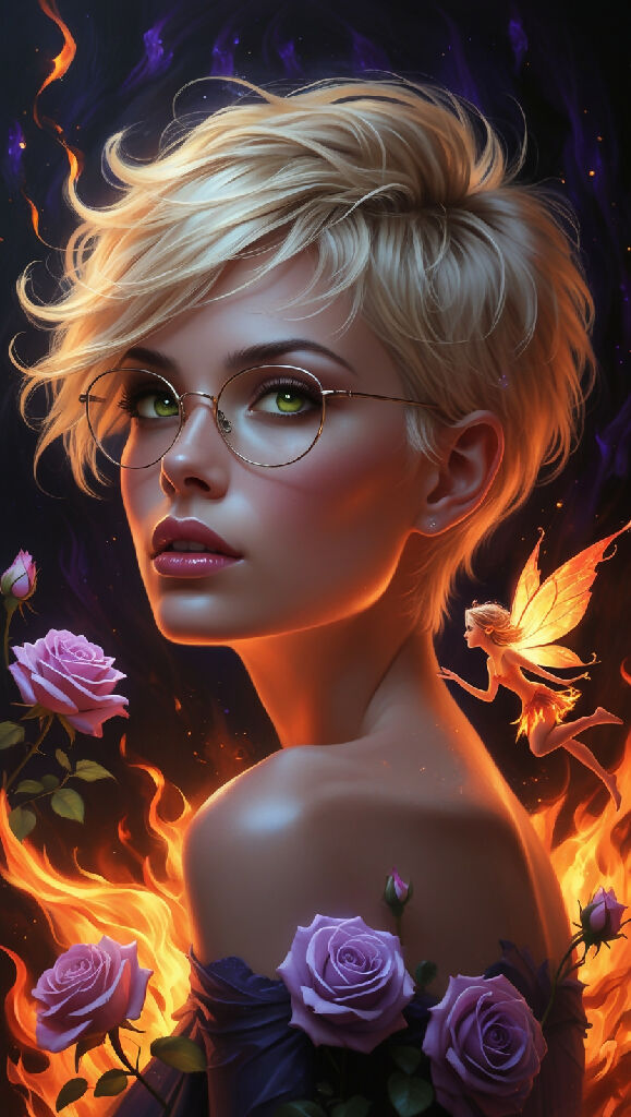 A dreamlike, magical portrait of a 35-year-old blonde woman with short, tousled pixie-cut hair blowing in the wind. Her skin glows softly, and she has striking olive green eyes behind stylish glasses that catch the glint of surrounding flames. The scene is suffused with fiery light, where vivid, swirling flames dominate the atmosphere, creating a surreal and enchanted ambiance. Her hair and shoulders are gently framed by blooming roses in varying shades of purple and pink, their petals glowing subtly as if touched by magic. Near her shoulder, a tiny, exquisite fire fairy with the body of a woman hovers protectively—wings made of flame, her expression fierce yet gentle, radiating power and care. The composition is rich in texture and detail, painted in the style of Karla Ortiz, blending fantasy realism with an ethereal, magical tone. The background is dark and deep, enhancing the intensity of the fire and floral elements
