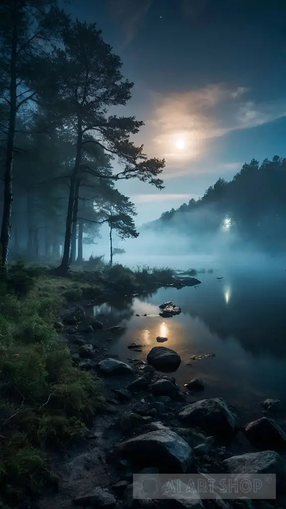 A dreamy landscape where the mystery lies HD, high quality, real, looks like it was taken with a professional camera, beautiful moon, delicate fog, in the deep forest and lake, high resolution,