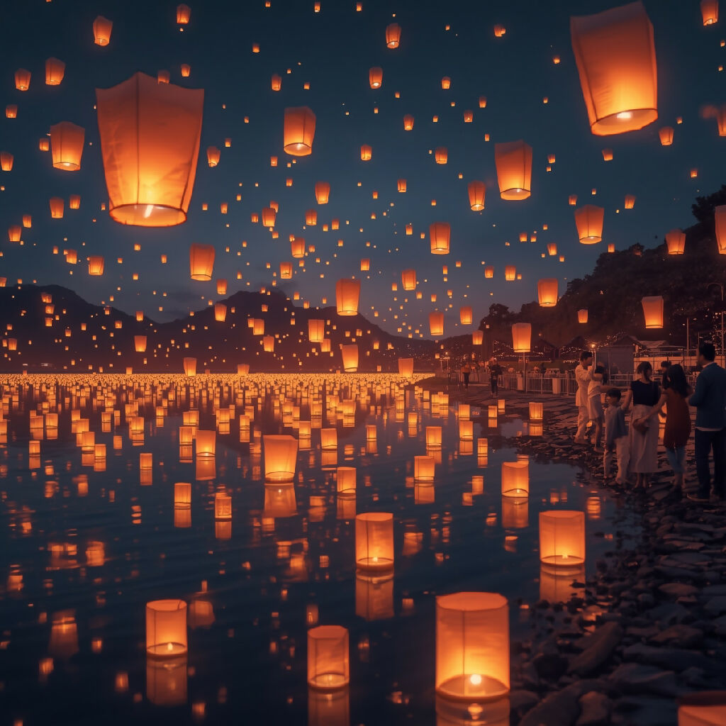 “A dreamy Taiwan Lantern Festival with floating lanterns lighting up the night sky, reflections on water, mountains in the distance, families and couples releasing lanterns, warm light illuminating faces, peaceful and magical mood — 8K, detailed, artistic style”
