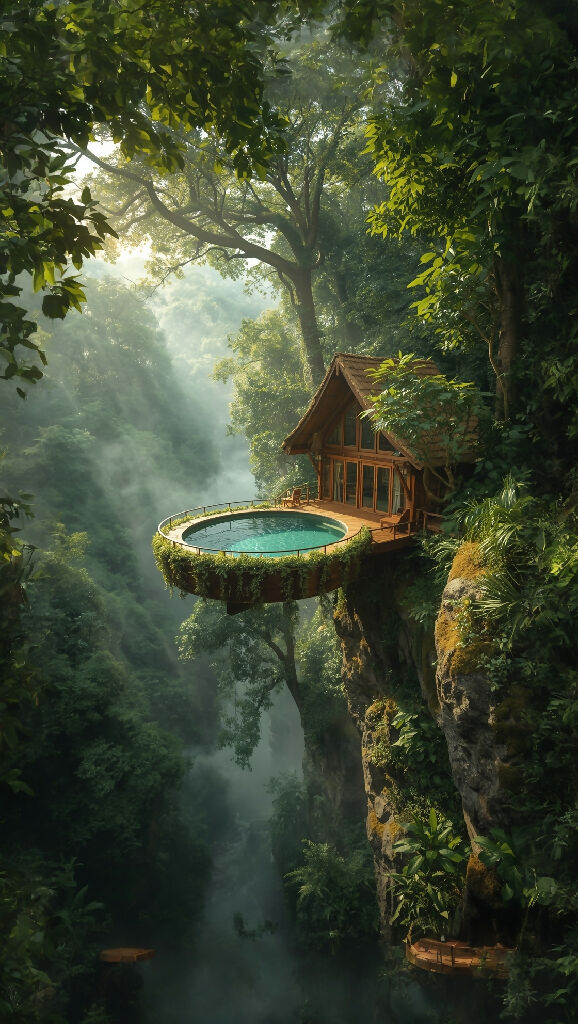 A fantasy-style luxury treehouse nestled deep in the vibrant rainforest, constructed from rich natural wood and adorned with lush green leaves, features a stunning infinity pool that appears to hang precariously over the rugged cliff's edge, surrounded by a serene atmosphere with soft mist and warm sunlight filtering through the dense foliage, showcasing a harmonious blend of nature and luxury, with the treehouse's organic design seamlessly integrating into the lush surroundings, and the infinity pool's calm waters reflecting the lush canopy above, creating a sense of tranquility and wonder.
