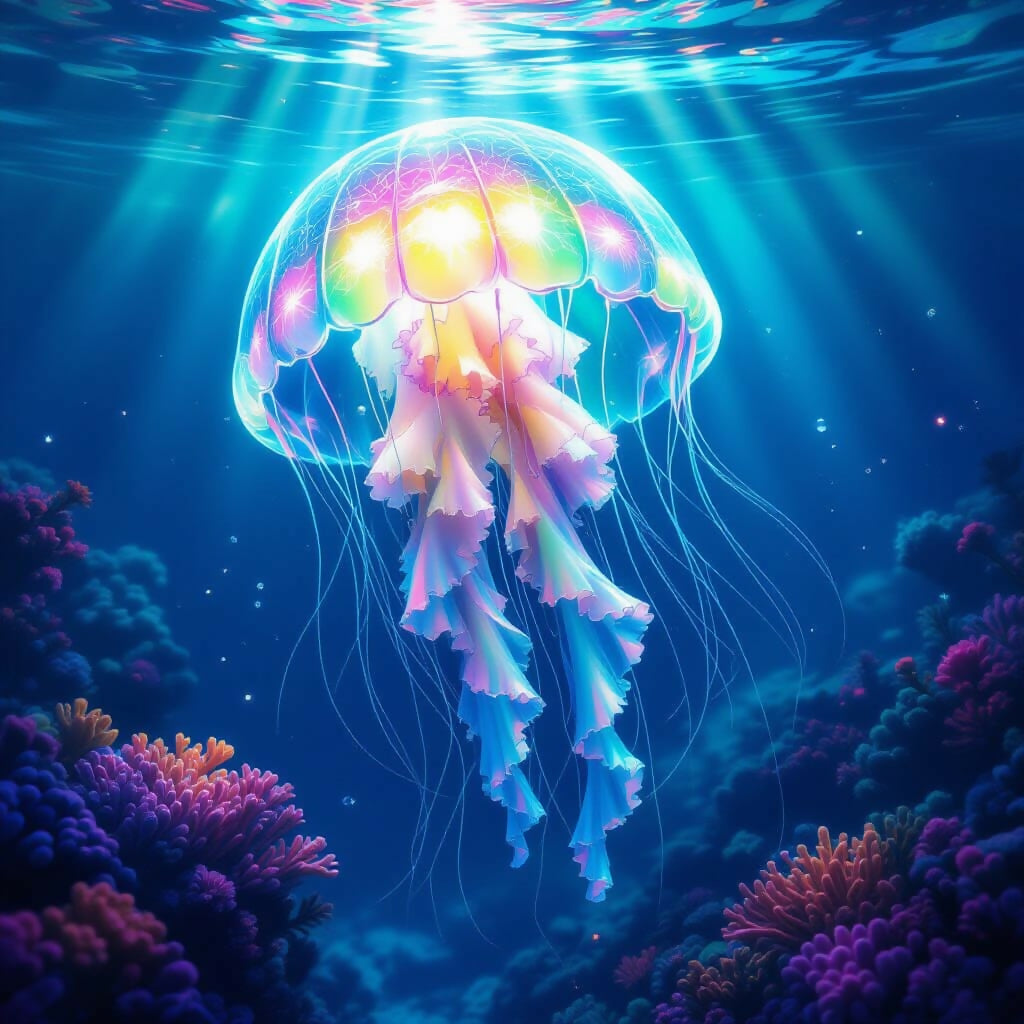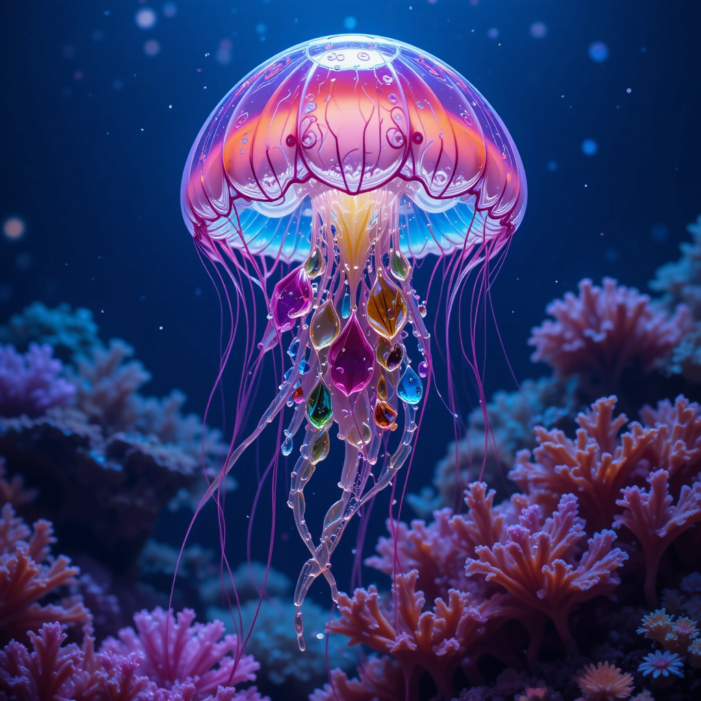 A floating jellyfish with stained glass tentacles drifting above a neon coral reef