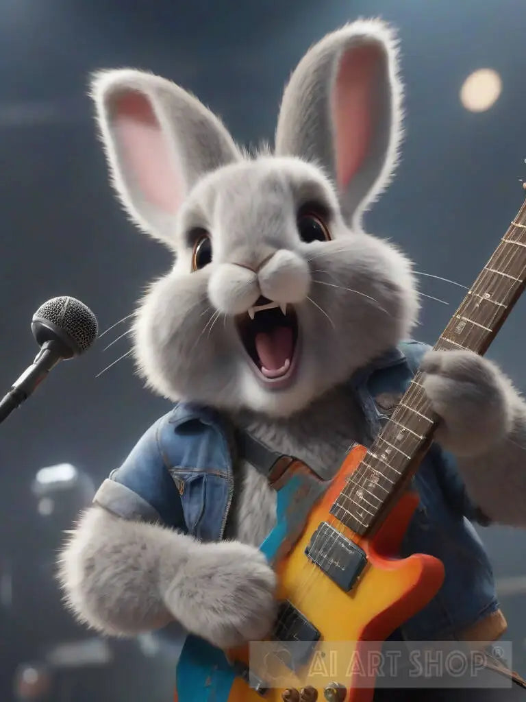 A fluffy hardrock rabbit guitarist, brutally and violently screaming into his microphone, by ivo80, realistic, artstation, 3d, octane, 8k