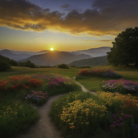 As your eyes travel across this scene, you notice the rolling hills and majestic mountains that gently frame the background. They fade ever so softly into the distance, just as the sun begins its graceful descent. The sky, painted with hues of orange, purple, and blue, holds wispy clouds that add endless depth to the horizon. The warm, golden glow of the setting sun casts an enchanting light, wrapping the entire scene in a restful embrace.