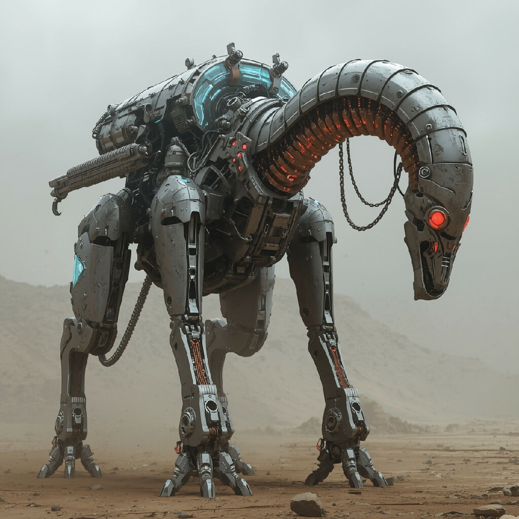 A gigantic robot with a metallic body and a long neck walks on four sturdy legs