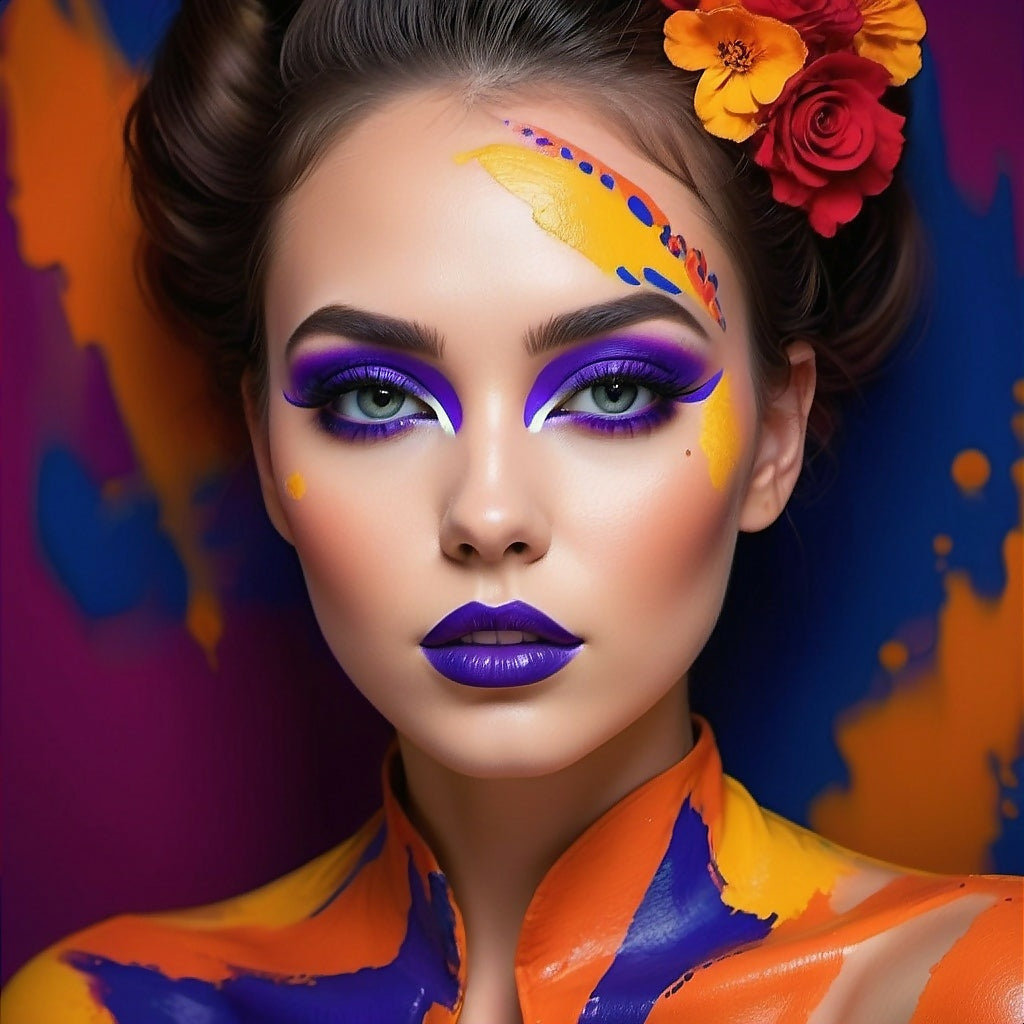 The girl's make-up is abstract, with strong colors, so is the background of the picture, the girl has a beautiful flower detail in her hair. AI generated image.