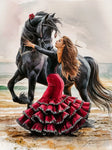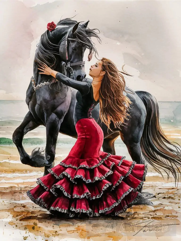 A captivating watercolor painting brings to life a mesmerizing scene of a young woman passionately performing a flamenco dance with a majestic Frisian horse. Her long, loose brown hair flows freely, complementing her striking black dress and vibrant red flamenco skirt. The horse, adorned with a black body and a delicately placed red rose in its mane, stands gracefully on its hind legs, its mane gently swaying to the rhythm of the dance. The idyllic seashore setting, bathed in soft, diffused light, envelops the viewer in an enchanting atmosphere. The harmonious connection between the woman and the horse is palpable, as their movements intertwine in a dance of beauty and strength. This breathtaking image, a blend of conceptual art, poster design, cinematic style, fashion, and wildlife photography, fashion, wildlife photography, poster, photo, 3d render