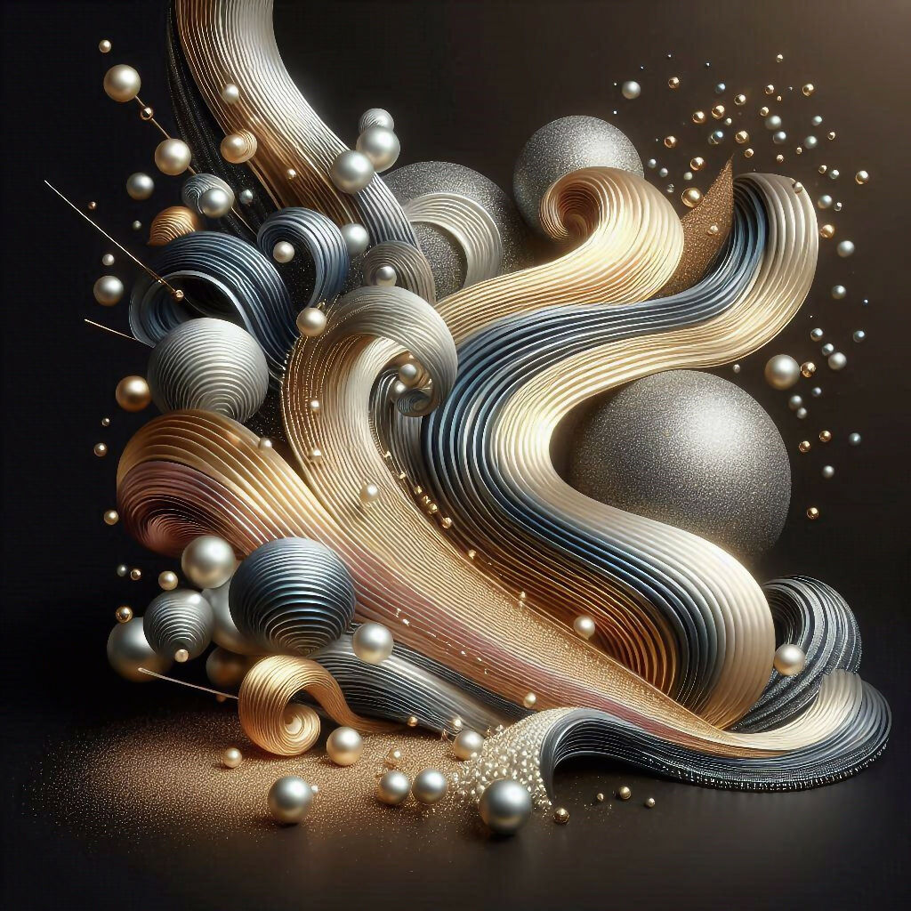A glamorous work of art that plays with curved waves and shimmering balls. The composition is a dynamic arrangement of soft, flowing wavy lines designed in different colors and textures. These waves are in shimmering metallic tones that reflect the light.