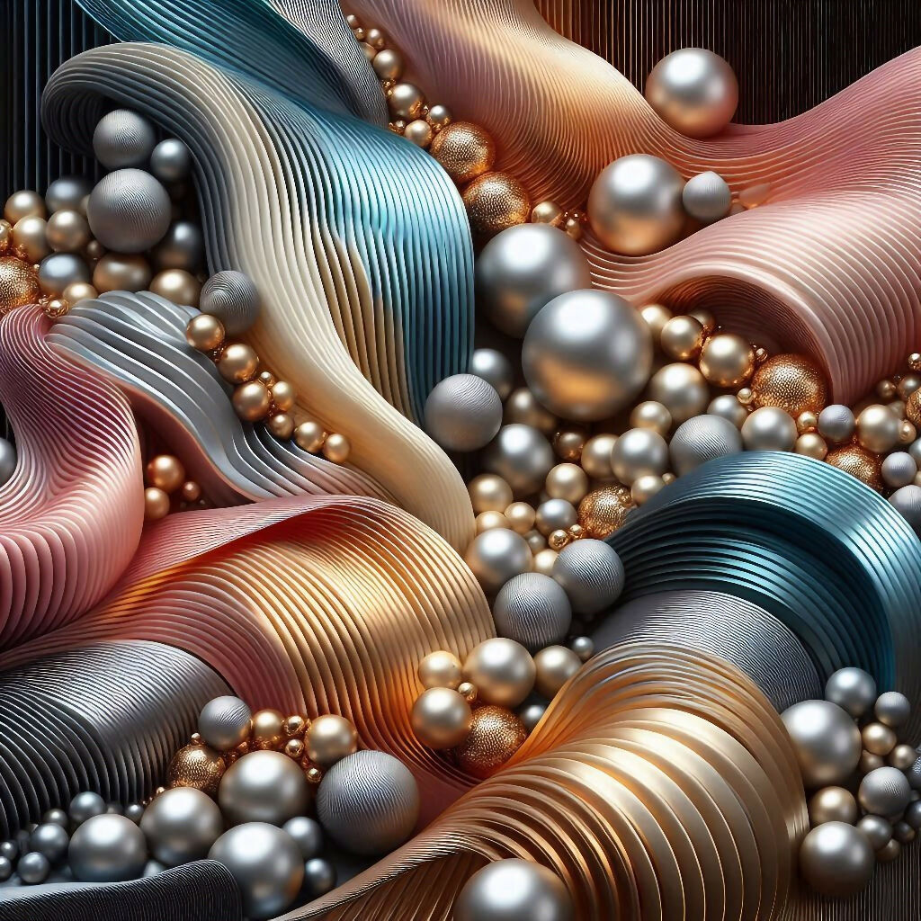A glamorous work of art that plays with curved waves and shimmering balls. The composition is a dynamic arrangement of soft, flowing wavy lines designed in different colors and textures. These waves are in shimmering metallic tones that reflect the light.