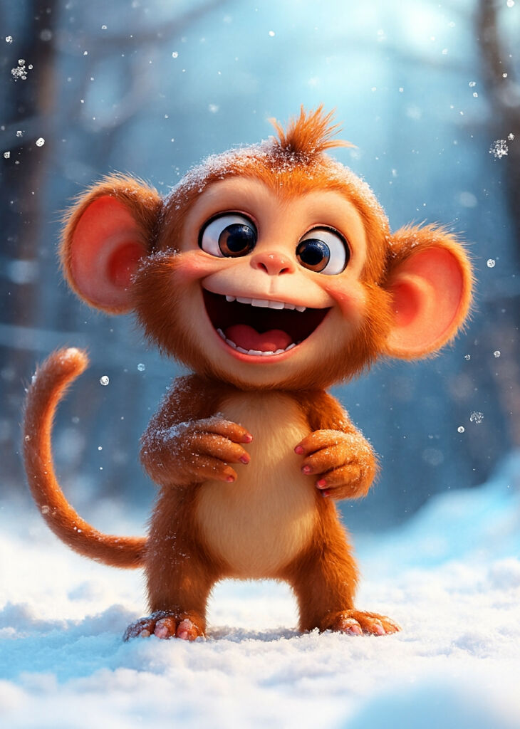 The monkey is standing on a blanket of white snow, which covers the ground. The background is a soft, blurry winter forest setting with falling snowflakes, emphasizing a cold yet magical atmosphere. The style is highly rendered and resembles modern 3D animation or a character design from an animated movie.