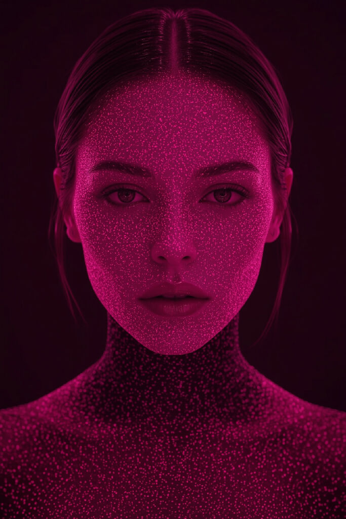 A hauntingly vibrant magenta-hued virtual influencer, each pixel pulsating with an otherworldly glow: her synthetic skin shimmers with an ethereal luminosity, casting an eerie light over the digital landscape. This surreal image is a hyper-realistic digital painting, showcasing the intricate details of her sculpted features and intricate cybernetic implants. The magenta hues blend seamlessly with the deep shadows, creating a mesmerizing contrast that draws viewers into the uncanny valley of her artificial beauty. The high-definition rendering captures every minute detail, from the delicate patterns etched into her virtual skin to the hauntingly lifelike gleam in her eyes. This image is a stunning example of the cutting-edge technology behind virtual influencers, blurring the lines between reality and simulation in an unforgettable visual experience.