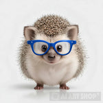 a hedgehog with small square glasses looking amused full body is isolated on a white background