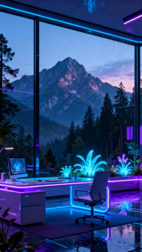 a high-tech secluded office, large panoramic window facing a majestic mountain range and dense forest at twilight, cool blue and purple ambient lighting inside the room, glowing bioluminescent plants, sleek futuristic furniture, peaceful atmosphere, digital art, 8k, highly detailed, photorealistic, ray tracing, synthwave color palette, clear glass, no rain, no text, no people