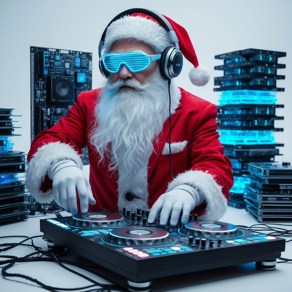 **A highly detailed digital illustration of Cyberpunk Santa Claus as a DJ, set against a pristine white background.** Santa wears his traditional red and white suit, but accessorized with sleek, futuristic headphones and glowing blue neon visor glasses. His long white beard is prominent. He is actively mixing on a sophisticated DJ controller, which features numerous glowing blue buttons and turntables. In the background, stacks of intricate, modular electronic circuit boards and computer components, glowing with subtle blue lights, create a high-tech backdrop. Comic book art style, vibrant colors, clean lines, sharp focus, festive and futuristic, ultra detailed, white studio background.