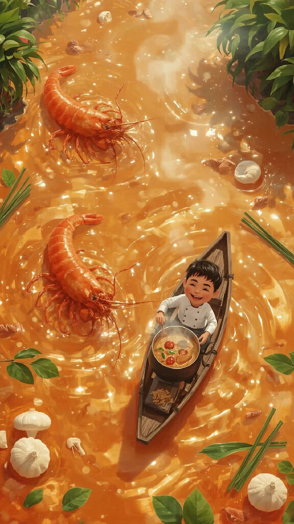 A highly imaginative and creative scene of a Tom Yum Goong river made of creamy orange broth, rich and fragrant. Two giant prawns float gracefully in the river along with straw mushrooms, galangal, and lemongrass. A joyful Thai chef is happily cooking Tom Yum in a steaming pot on a wooden boat, surrounded by floating ingredients. The atmosphere is warm, inviting, and magical, with aromatic steam rising into the air. Realistic cartoon style, soft lighting, vibrant colors, food fantasy concept, 2D highly detailed illustration