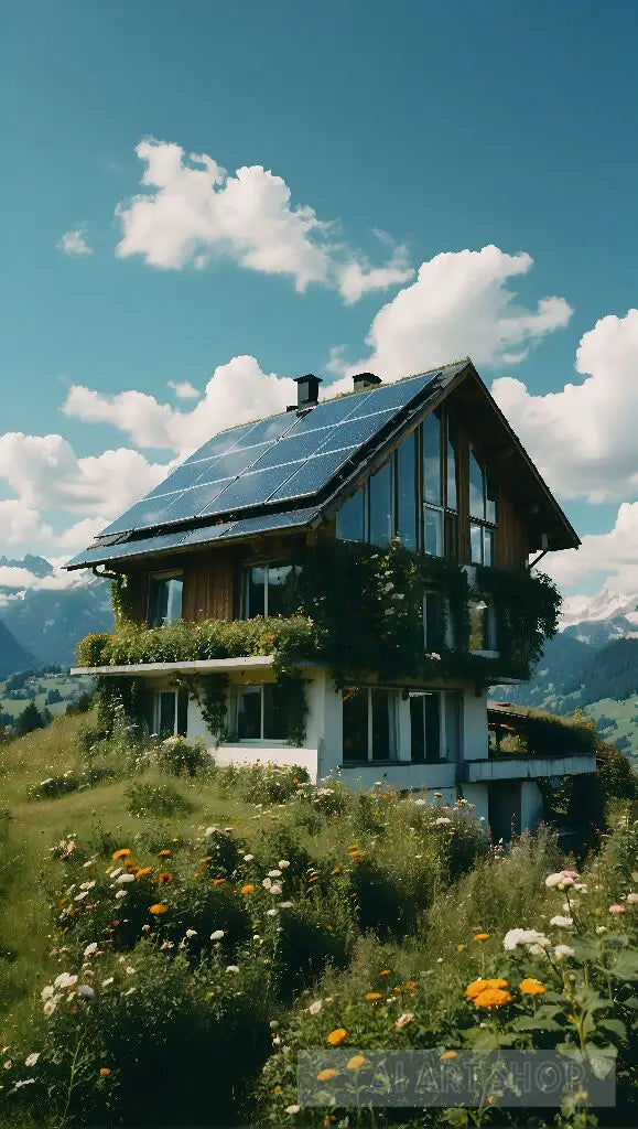 gstaad traditional modern hybrid house with solar panels, switzerland, panoramic, natural lighting, clear sky, natural lighting, heavenly clouds, blue sky with with clouds, bright sun with luminous effect, hbo netflix color grading lut, cinestill 800t at 50daylight, 35mm, fine grain color, Nikon Z6 camera, high contrast, sfumato and chiaroscuro photography, 500px, studio ghibli landscapes