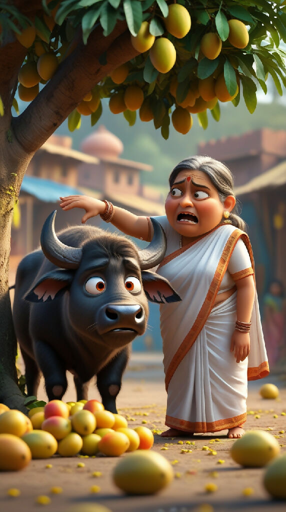 "A humorous 3D cartoon-style scene showing an angry Indian grandmother in a white saree scolding and tapping a mischievous buffalo on the head under a mango tree