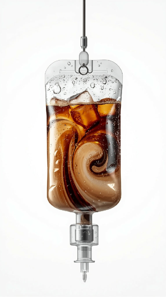 A hyper-realistic photo of an intravenous (IV) fluid bag filled with iced brown sugar milk coffee (Indonesian style “es kopi susu gula aren”), hanging from a metal hook against a clean white background. The transparent IV bag shows a beautiful swirl of dark brown sugar syrup mixing with creamy milk coffee, with visible ice cubes floating inside. Condensation droplets appear on the outside of the plastic bag, giving a cold and refreshing look. Soft studio lighting, high-contrast, minimalistic composition, realistic reflections, product photography style, ultra-detailed textures, no text, no label. Negative prompt: text, label, logo, watermark, human, medical symbols, syringe, blur, low quality, overexposure, cluttered background