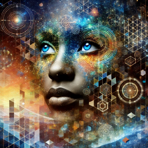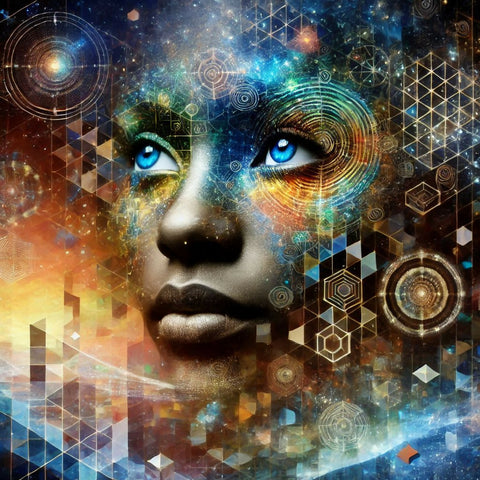 The background is a mixture of galactic colors - blue, gold, orange and black - with stars, nebulae and abstract shapes symbolizing the universe. Complex geometric patterns run across the face and surroundings, including hexagons, circles, cubes and other multi-dimensional shapes reminiscent of sacred geometry. These symbols are rendered in a shimmering, holographic style and convey the impression of science, spirituality and infinite expanse.