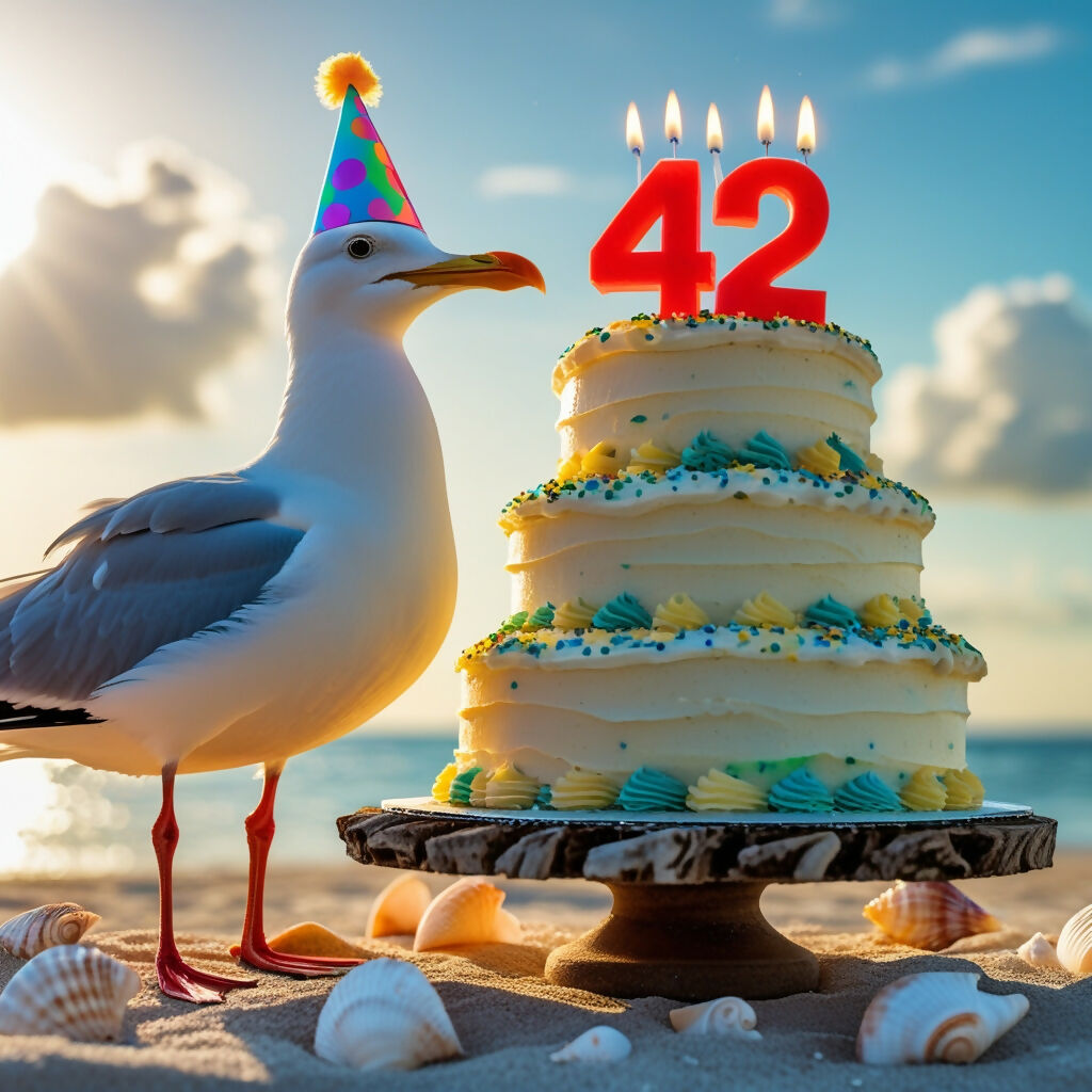 A joyful seagull, adorned with a colorful party hat and a bright, beaming smile, stands before a vibrant, multi-tiered birthday cake, illuminated by 42 soft, warm, and golden candlelights, against a serene, sun-kissed sky with a few puffy white clouds, the cake featuring creamy white frosting, decorated with sprinkles in shades of blue, green, and yellow, and a large, bold, red numeral '42' made of sugar, situated on a rustic, driftwood-textured beachside pedestal, surrounded by a few scattered seashells and a sprinkling of sand.