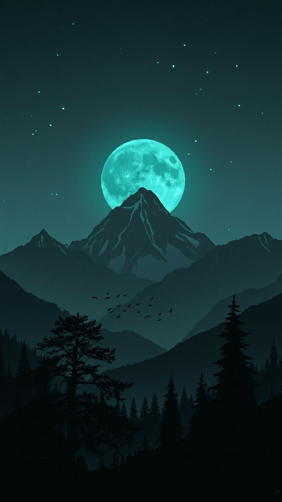 A landscape at night, featuring a large, glowing turquoise moon. Dark, silhouetted mountains and a lone tree are visible. The moon is positioned centrally, slightly above the middle of the image, casting a soft, ethereal light on the scene. The mountains rise in the background, with the peaks reaching toward the upper portion of the frame. The tree, depicted with simple, stylized lines, branches out from the middle ground toward the upper left part of the image. The colors are predominantly dark grays, blacks, and a glowing turquoise, creating a serene and mysterious atmosphere. Small, scattered, pale blue stars dot the dark sky. The image's style is evocative of a stylized illustration or painting, with a focus on mood and simplified forms. A flock of small black birds is present in front of the moon, indicating a sense of movement. The composition is centered on the moon, with the mountains and tree framing the scene. The overall perspective is slightly from below, looking up toward the moon and mountains. The lighting is soft and emphasizes the glowing moon, making it the central focus.