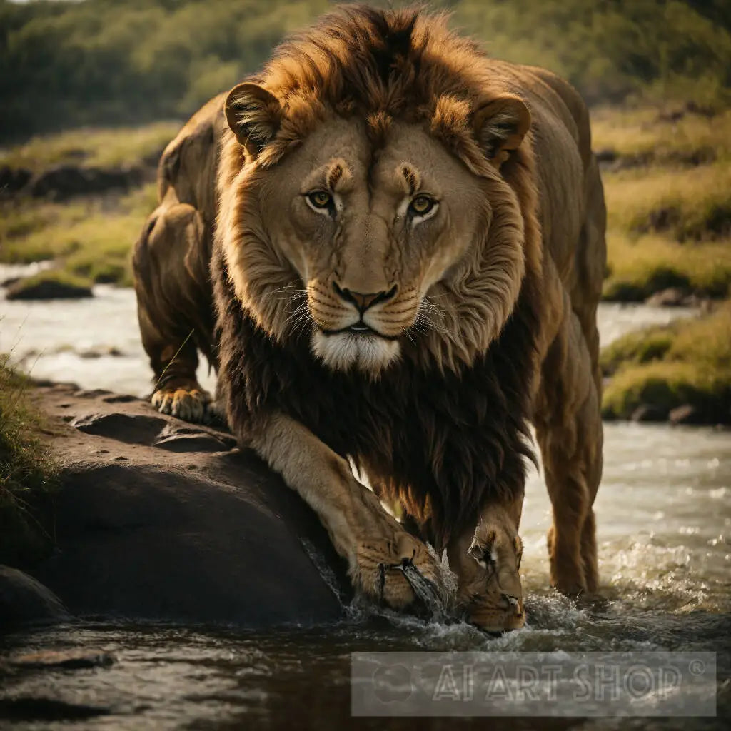 A huge lion image stands in the water drinking in a forest full of trees