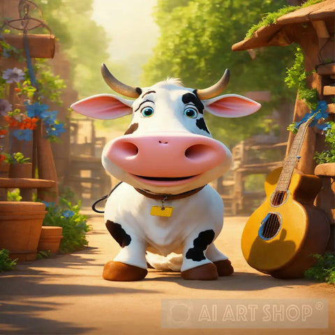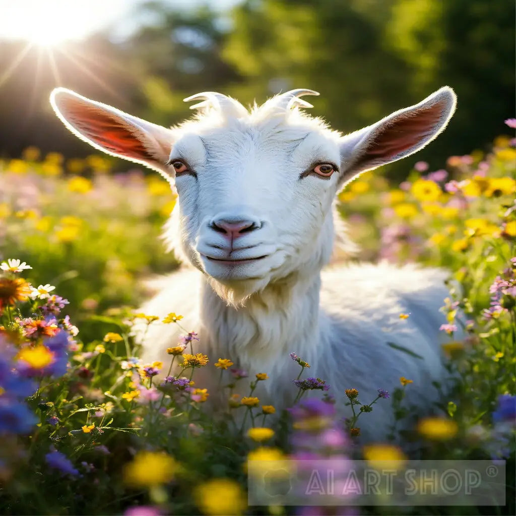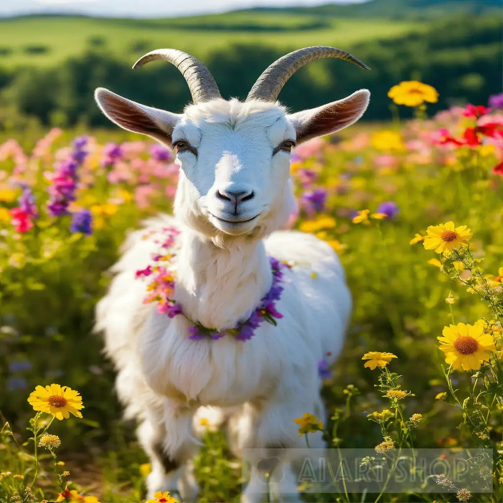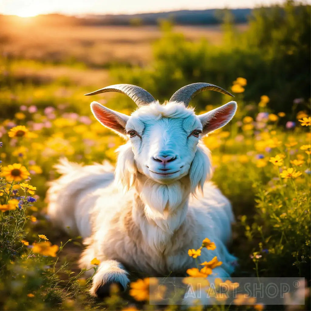 A small cow in the barn, a goat in the middle of flowers, a guard dog and a cute pig
