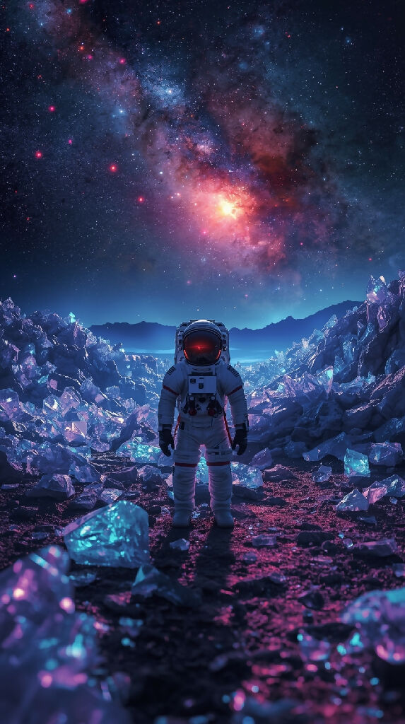 A lone astronaut stands on a shimmering alien planet covered in giant crystalline structures reflecting neon blues, purples, and greens. The galaxy above glows with countless stars and nebulae, and the astronaut’s reflective visor mirrors the radiant light of the twin suns. A sense of wonder and solitude fills the cosmic landscape. Ultra-detailed, cinematic lighting, 8K, realistic textures, sci-fi atmosphere.