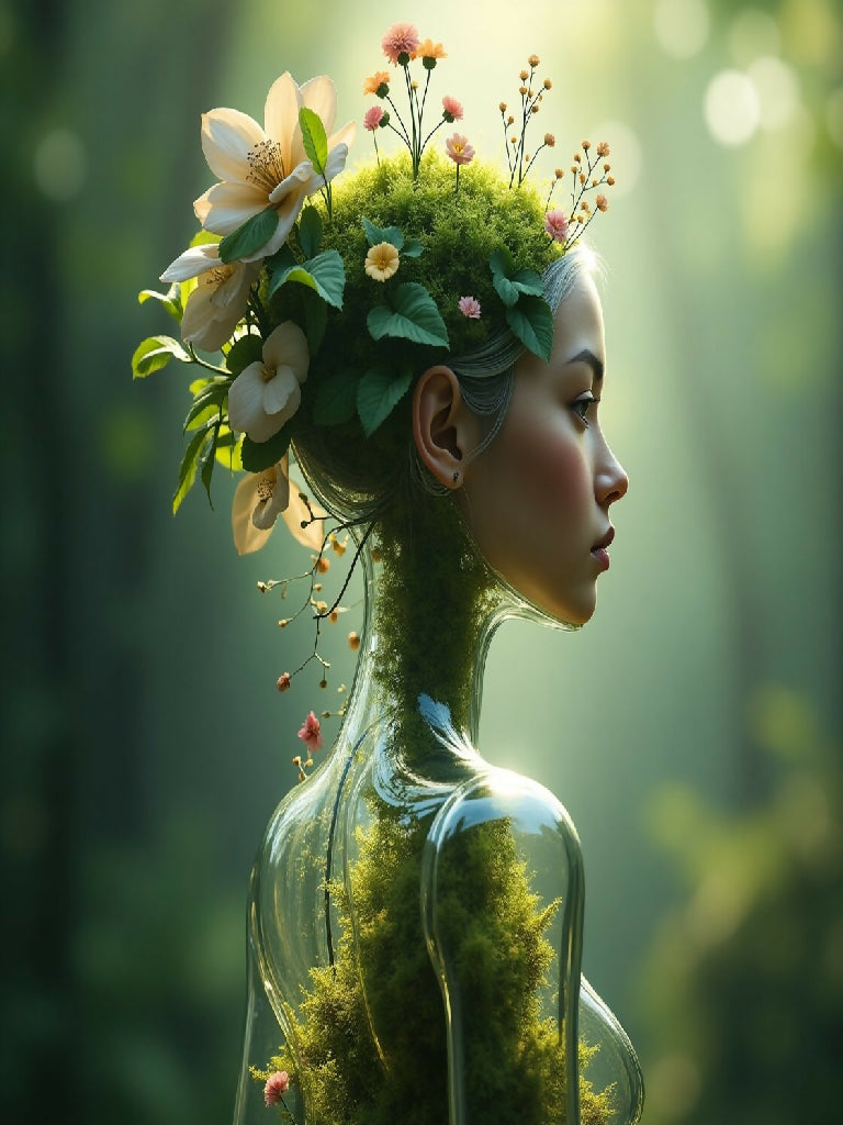 A luminous, transparent glass woman figure with an hourglass body, showcasing an intricate internal ecosystem, featuring miniature plants with delicate moss and flowers sprouting from within, blurring the line between surreal nature and organic growth, set against a dreamy bokeh background that evokes an ethereal atmosphere, with a focus on a portrait profile, adorned with lush green foliage, symbolizing biodiversity and the inner world, rendered in stunning 3D digital art with photorealistic textures, highlighting the intricate details of the figure's skin, hair, and surroundings, with a medium hairstyle that appears to be woven from the very plants and flowers that inhabit her, all presented in high-resolution with an emphasis on capturing the subtle play of light on her fragile, crystalline form.