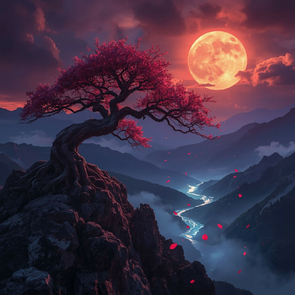 A majestic, stylized fantasy landscape featuring a single ancient bonsai-like tree with vibrant pink-red leaves growing atop a dark rocky mountain peak. The twisted trunk of the tree is beautifully gnarled, with delicate branches reaching outward against the backdrop of an oversized glowing full moon. The sky is filled with warm, dramatic twilight colors — deep purples, magentas, and crimson hues — creating an ethereal and serene mood. In the background, a vast range of misty mountains fades into the distance, with sharp peaks and cool blue shadows. At the bottom of the scene, a glowing, gently flowing river winds through the dark valley, reflecting moonlight in soft blues and silvers. Red leaves are scattered through the air like glowing embers, enhancing the dreamlike atmosphere. Highly detailed, cinematic lighting, soft fog, epic scale, fantasy concept art style.