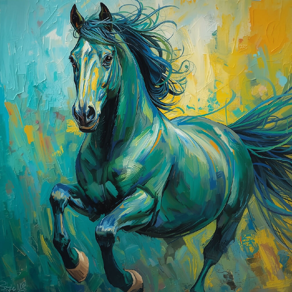 A majestic horse painted on a large canvas with vibrant colours such as emerald green
