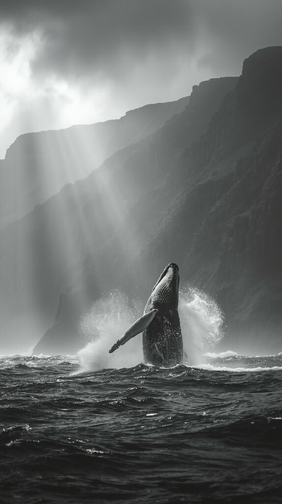 A majestic humpback whale breaching dramatically out of the stormy ocean