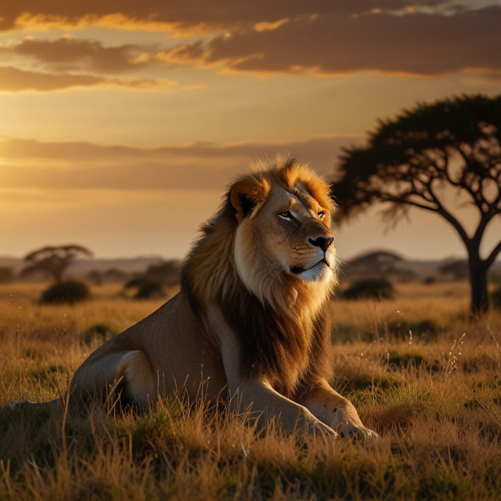 A majestic lion lounging on a grassy savanna at sunset, surrounded by the golden hues of the setting sun and the vast expanse of the African plains 1