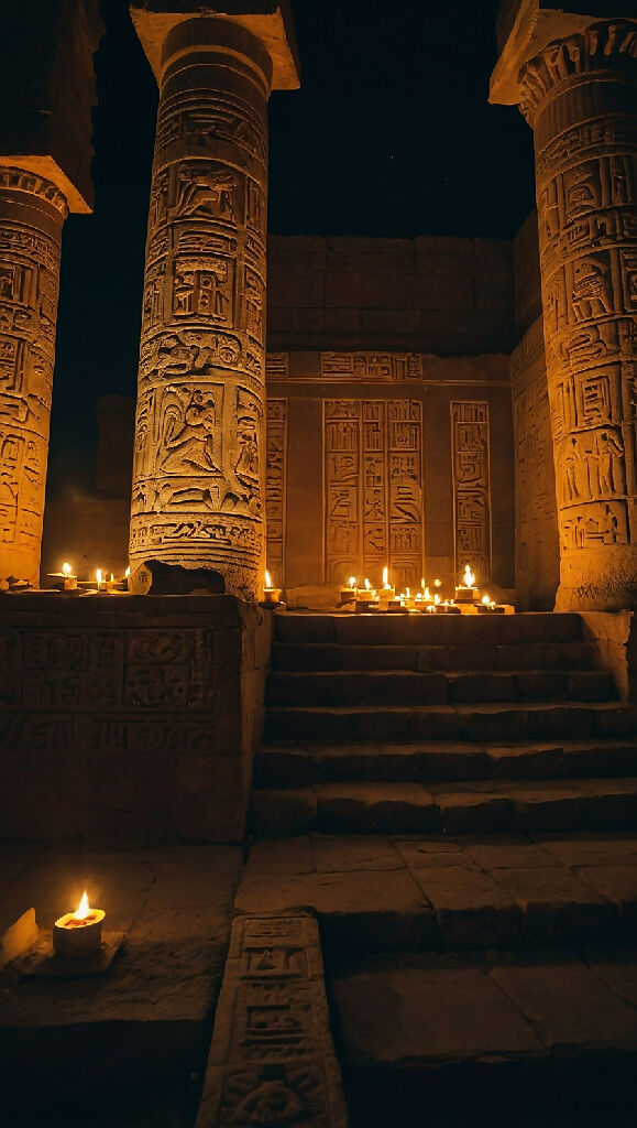 A majestic temple complex in the ancient city of Babylon, known as Esagila. The huge main temple is dedicated to Marduk, with tall, ornate columns, golden statues and relief-decorated walls. Priests in white robes offer incense before an altar. Night view with torches and sacrificial ceremonies