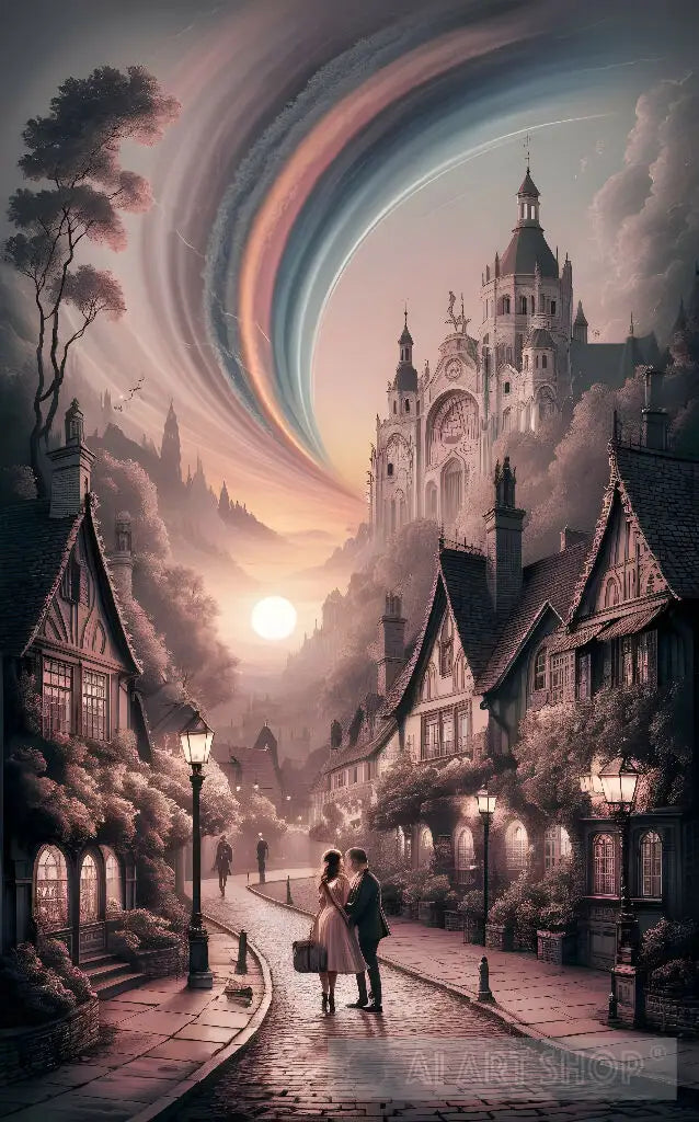 A man and a woman stand on a beautiful road from the past on a foggy, moonlit night in the middle of magnificent old-style buildings with a rainbow visible in the sky.