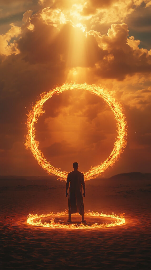 A man standing alone in a desert at dusk, fire surrounding him in a circle, divine light breaking through the clouds above, biblical cinematic style, ultra-realistic lighting, symbol of faith being tested, epic and dramatic atmosphere.