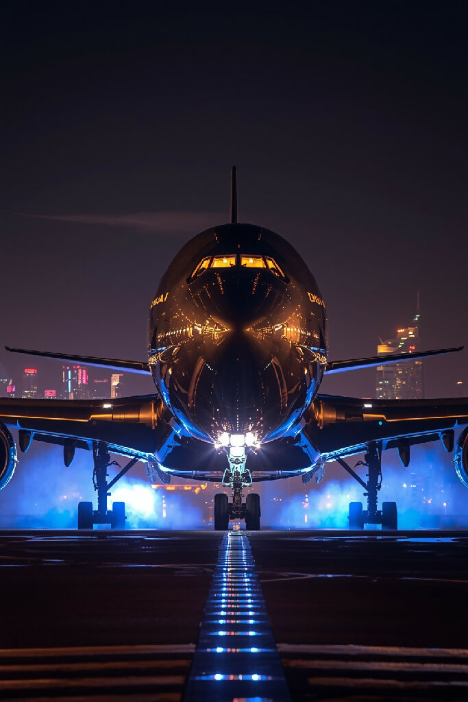 A massive futuristic aircraft with three decks and glowing blue engines prepares for takeoff at a futuristic Dubai airport at night. The plane’s metallic body reflects thousands of city lights and neon signs from the skyline. The word “DUBAI — The Future of Aviation” shines brightly across the fuselage in glowing gold and white letters. As the engines ignite, blue plasma energy swirls beneath the wings, illuminating the runway. The aircraft begins its powerful takeoff — dust and reflections shimmer around it