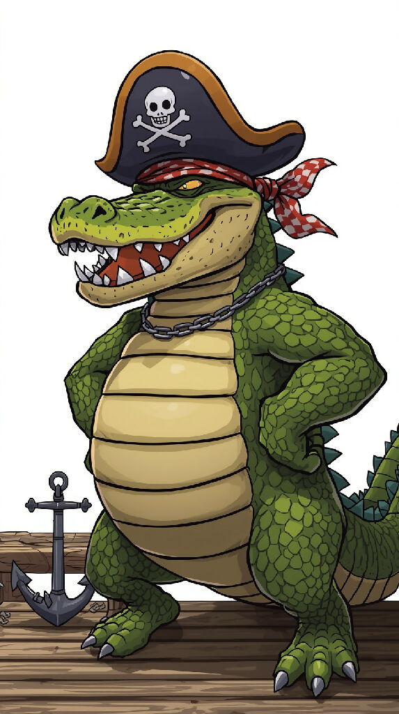 A massive, grinning pirate crocodile, wearing a comically small pirate hat on its huge head and a red-white checkered bandana. A heavy anchor is chained to its tail. Menacing but playful expression, sharp teeth, anthropomorphic, cartoon style, character design, scales detailed, vibrant colors, standing on a wooden dock.