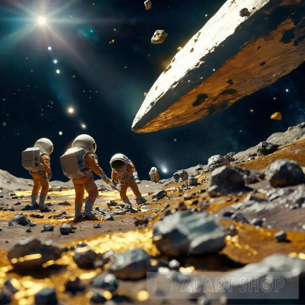 A miniature depicting a futuristic scene where a group of astronauts is gathering valuable minerals on an asteroid. In the foreground, an astronaut is seen holding a space rock shining with golden and silver hues, indicating the presence of precious metals. In the background, a space base equipped with extraction and storage equipment is visible, while small fragments of space rock float around. The scene conveys the idea of resource exploitation in space and the possibilities of gaining wealth through space exploration.