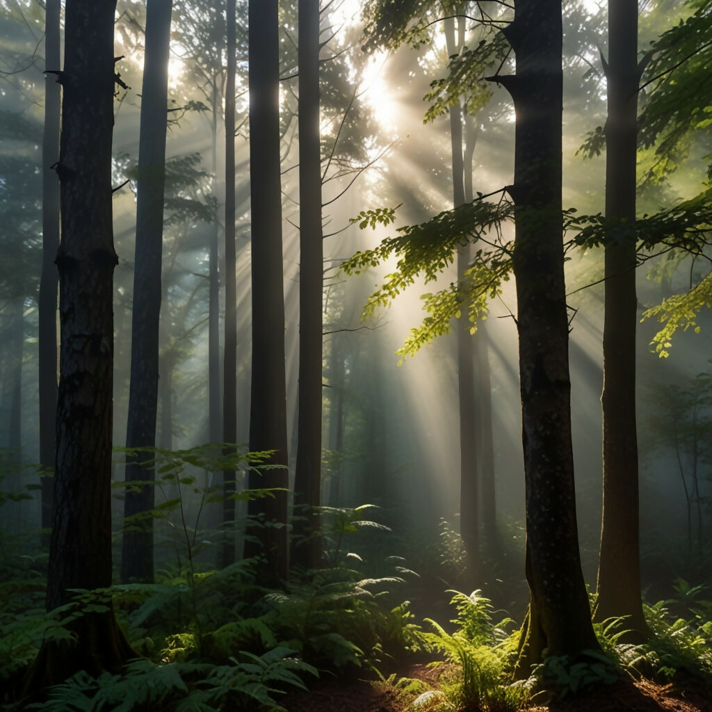 A misty morning in a dense forest with rays of sunlight filtering through the trees 1