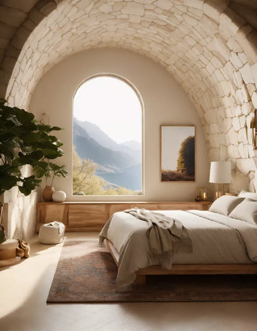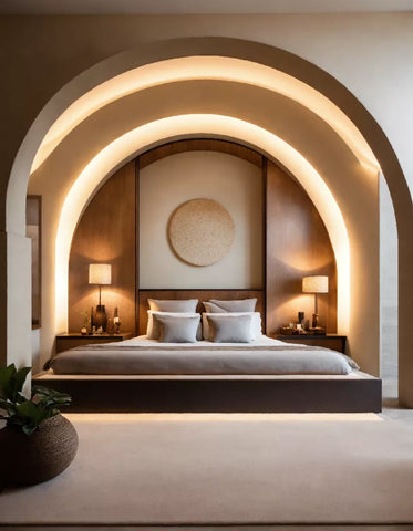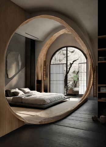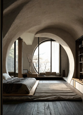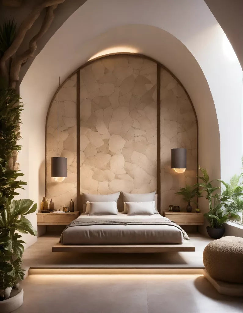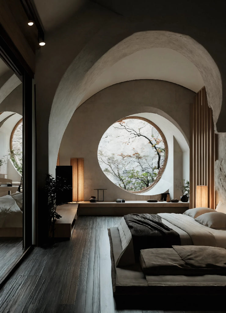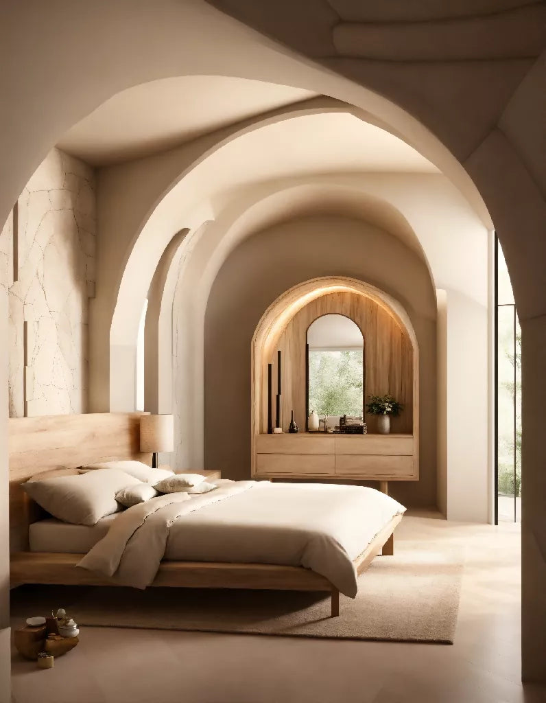 The image features a modern, upscale Japanese minimalist apartment with a serene and luxurious design. The space combines soft white cream stone walls with subtle textures and light wood accents, creating a peaceful and warm atmosphere. The room is designed with sleek lines and smooth surfaces, accentuated by light wood round arches that elegantly frame the space, adding a sense of openness. The dark bedroom is the focal point, with a low-profile bed and plush bedding in deep, calming tones. Soft lighting emanates from hidden sources, highlighting the delicate architectural details. A small, clean-lined desk or storage unit complements the design. Natural elements, like plants, add a touch of green, enhancing the tranquil ambiance. The overall mood is serene, modern, and thoughtfully minimalist.