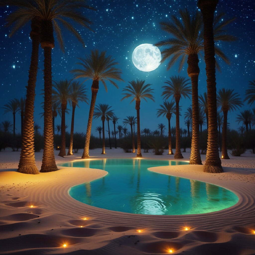 A moonlit desert oasis date palms surrounding a glowing pool 2