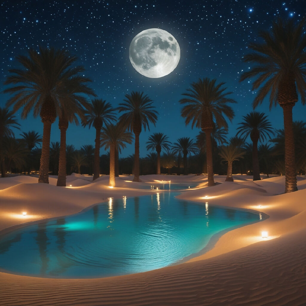 A moonlit desert oasis date palms surrounding a glowing pool 3