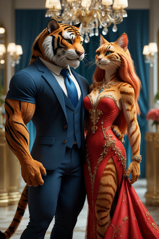 A muscular anthropomorphic tiger wearing a well-fitted dark blue suit with a white shirt and matching blue tie, and a female anthropomorphic cat with long orange hair and natural reddish-orange fur, wearing a glamorous red evening gown with golden details, standing together in a boutique, tiger gently holding her waist, chandelier above them, elegant interior, smiling softly at each other, realistic fur and fabric, cinematic vibe