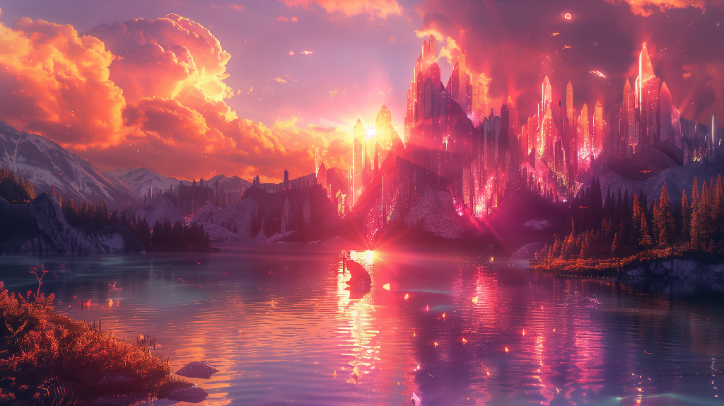 Add colours to your home with this beautiful mystical landscape featuring towering crystals and glowing plants, blending surreal and natural elements into a dreamlike vision.