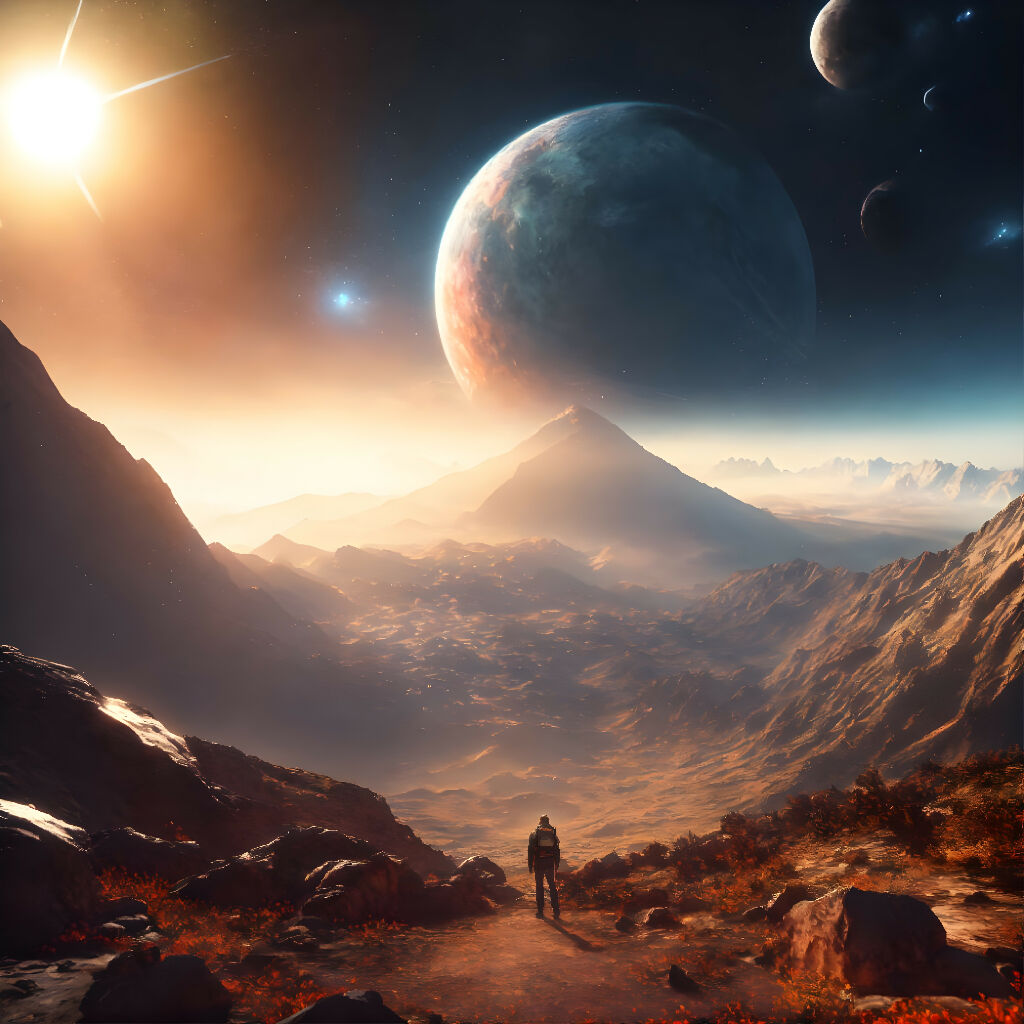A person being reincarnated into a new world, sky nebula, sci-fi 3D scene of a showing mountains , maximalism, ambient occlusion, volumetric light, sun beam, atmospheric haze, unreal engine, hyper realism, realistic shading, cinematic composition, realistic render, octane render, detailed textures, photorealistic, wide shot
