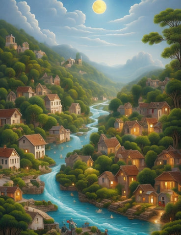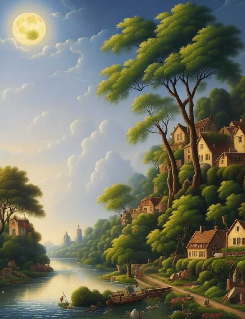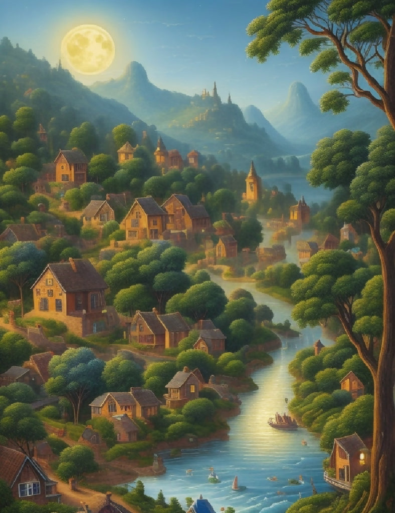 a painting of a village with a river and trees in the background and a full moon in the sky, Chris LaBrooy, naive art, detailed painting, a detailed painting