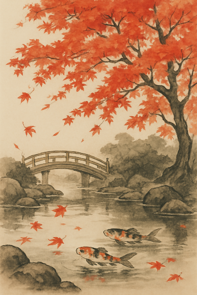A peaceful autumn scene with a red maple tree, a wooden bridge, and koi fish swimming in a calm, reflective pond
