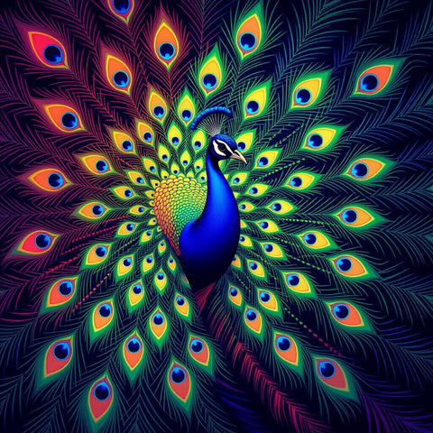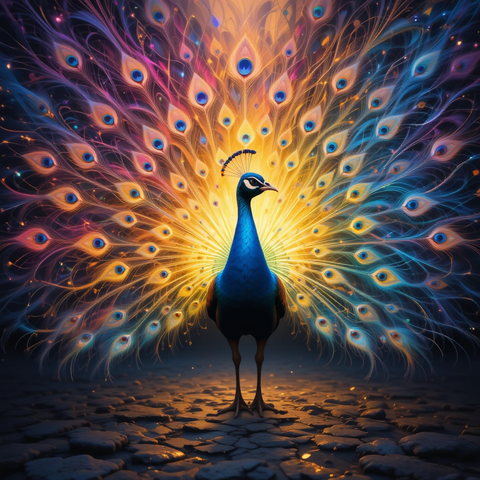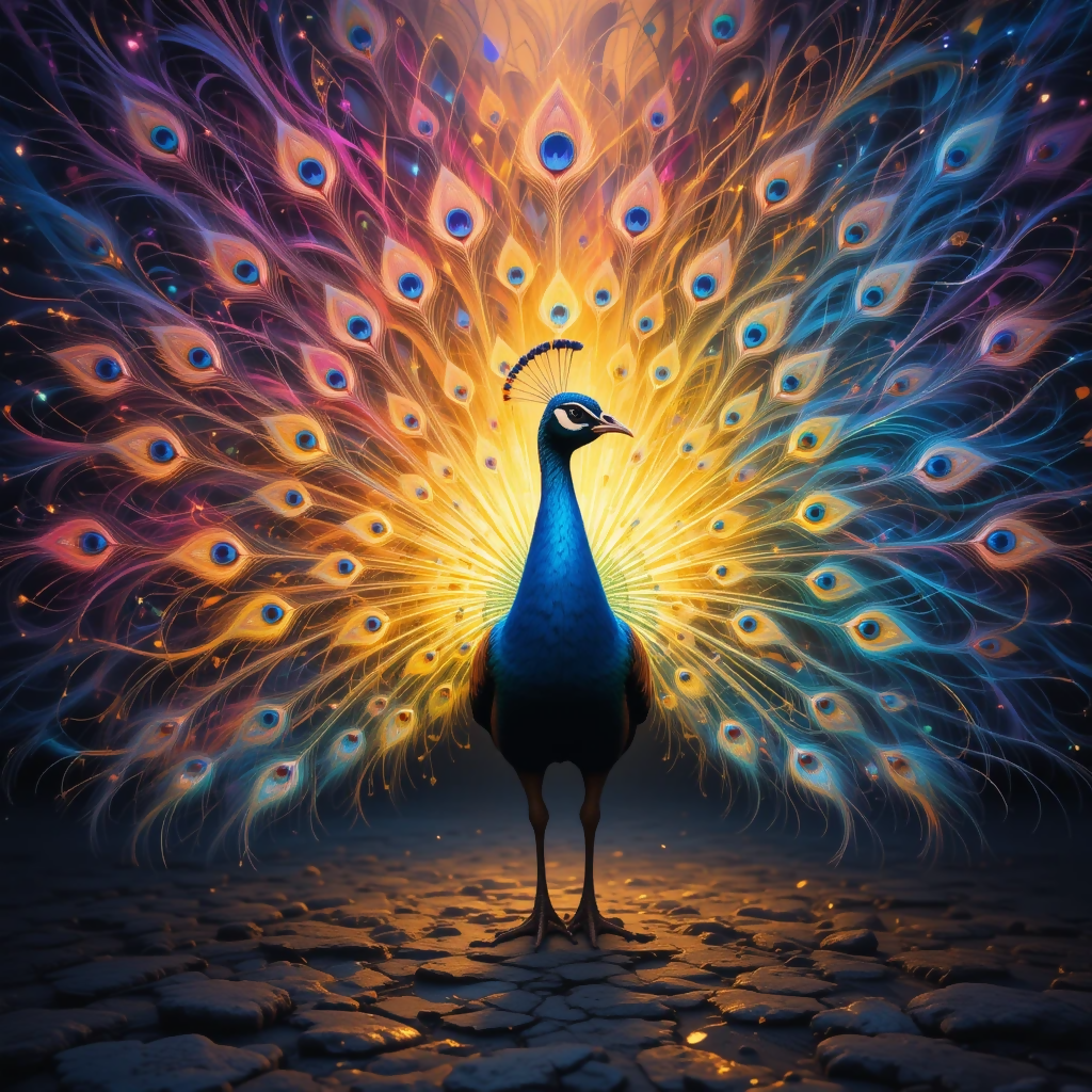 A peacock with electric rainbow feathers spreading into abstract patterns of infinity