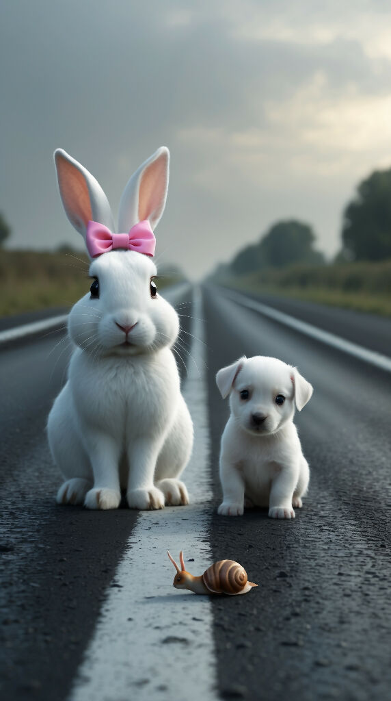A photorealistic, cinematic scene of a white rabbit with a pink bow and a small white puppy sitting side by side on the edge of an empty rural highway, watching a small snail crawl slowly across the road. The two animals look peaceful and curious, their eyes following the snail’s slow movement. The road is long and deserted, with soft light filtering through an overcast sky. The atmosphere is calm, contemplative, and emotionally rich, capturing a moment of shared stillness between friends appreciating the small wonders of life.